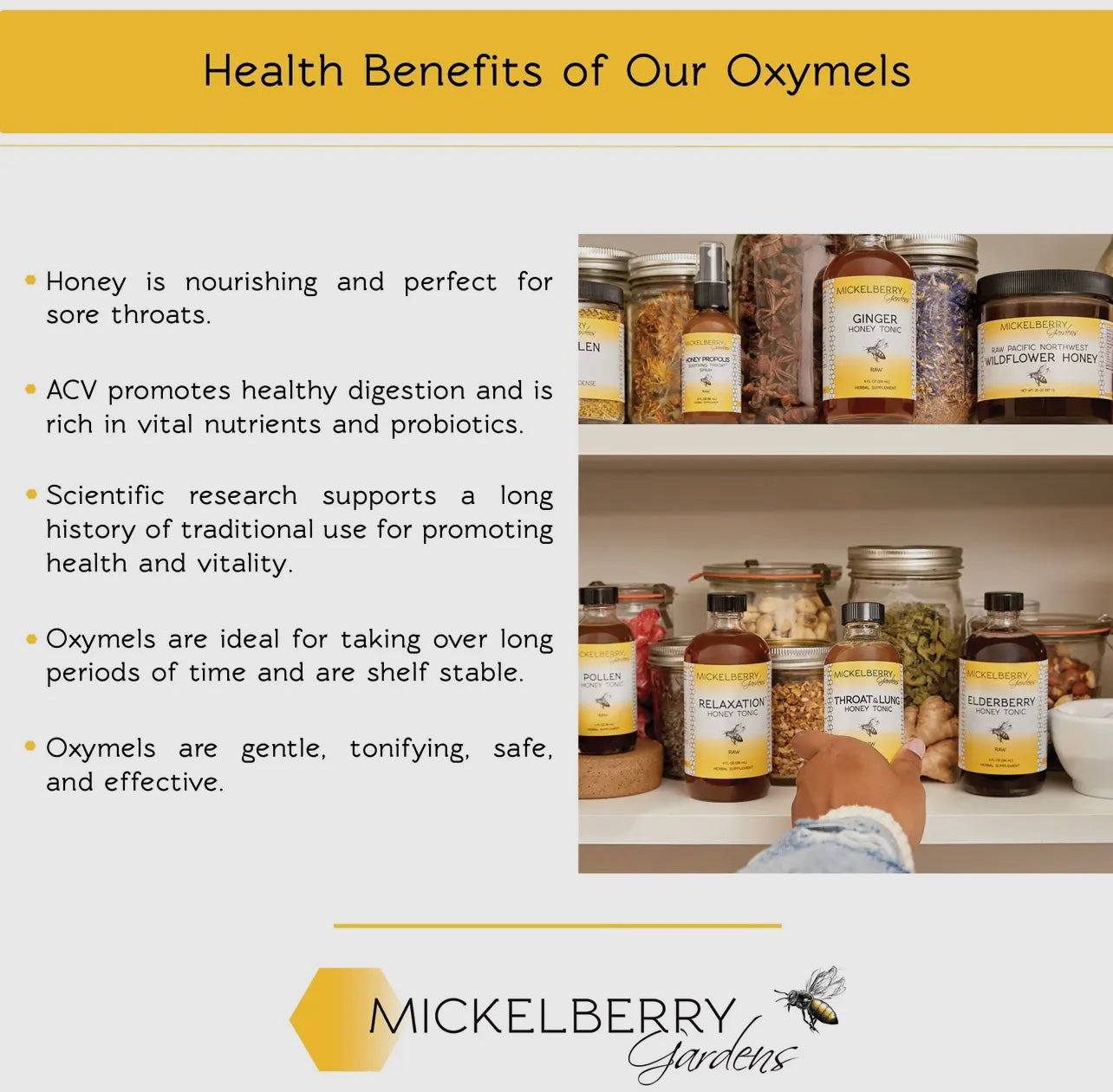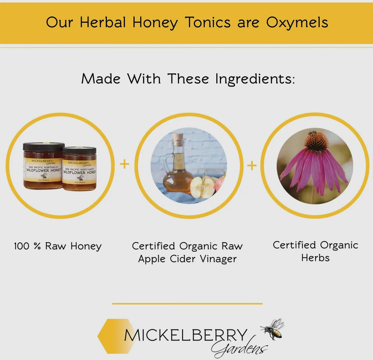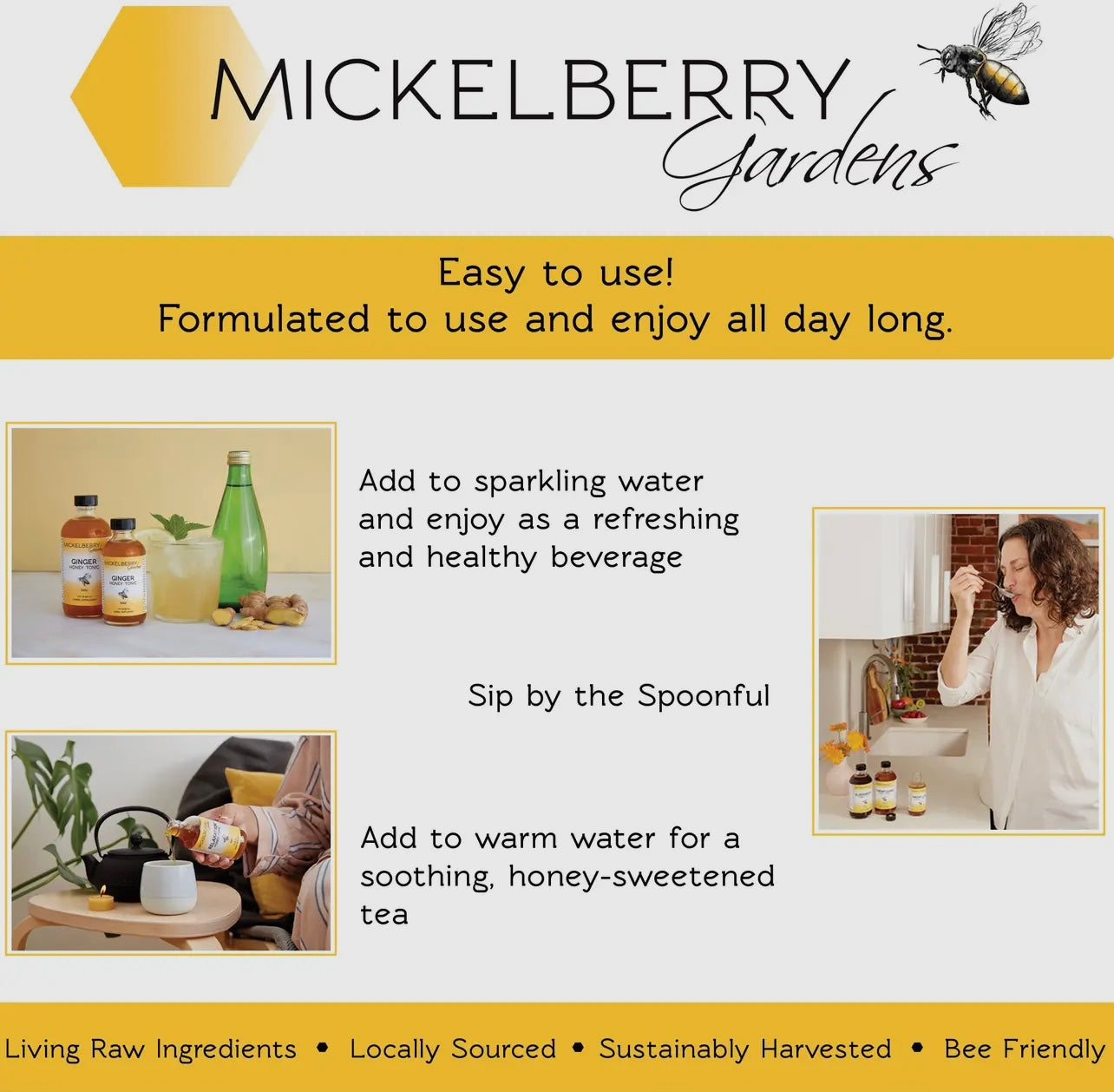Nourishing and anti-microbial for sore throats • Promotes healthy digestion • Respiratory system support • Promote health and vitality • Gentle tonifying, safe and effective • Shelf stable living raw ingredients • Locally sourced • Sustainably harvested • Bee friendly • Made in USA Our honey tonics are designed to take by the spoonful or as needed. They're also delicious added to warm water, tea, or sparkling water. They are perfect for preventing and addressing cold and flu symptoms. Elderberry Honey Tonic is also great for travel to make sure the whole family stays well. Just take a spoonful at the first sign of illness. Elderberry Honey Tonic is sweet like honey, and has a delicious sour zing from the apple cider vinegar. It has a yummy berry flavor which is why its perfect for the whole family. The texture is thick and syrupy. All our honey and certified organic apple cider vinegar is sourced from regional producers. We only purchase the freshest, whole organic herbs — often direct from local farmers. We make all our products with strict attention to quality. Our facility is certified GMP-compliant, and is free of all major allergens, including gluten.