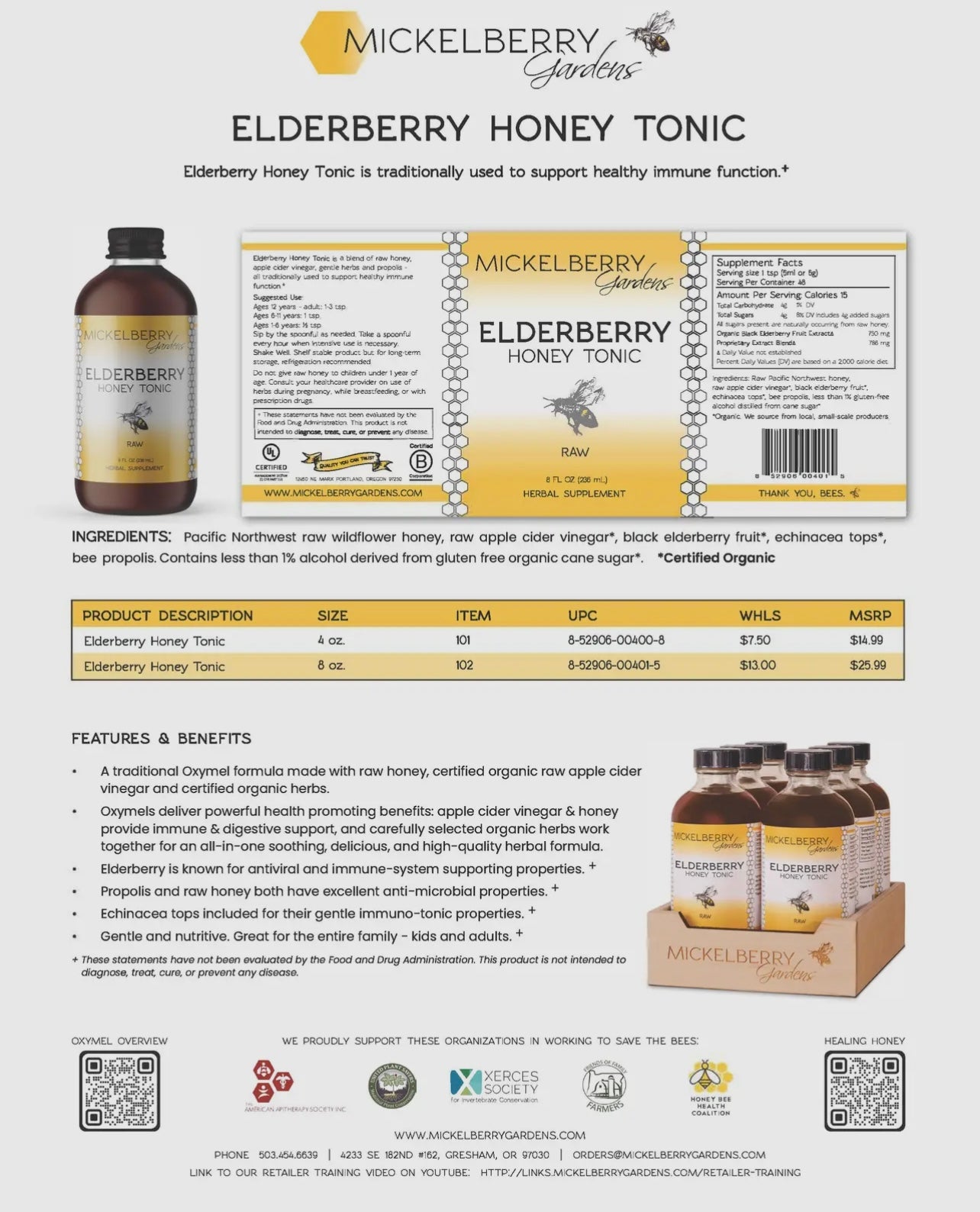 Elderberry Honey Tonic is a blend of raw honey, raw apple cider vinegar, and gentle herbal remedies traditionally used to support healthy immune function. We have included organic black elderberries, organic echinacea tops, and Pacific Northwest propolis to support and nourish the immune system. It’s an excellent addition to the family medicine cabinet — kids love it!