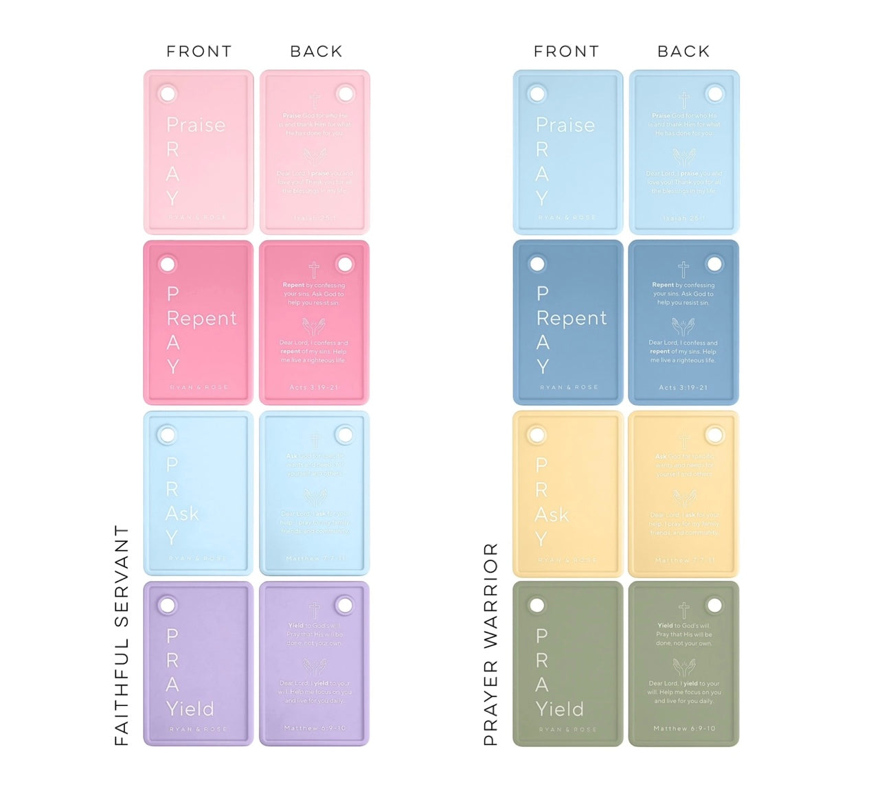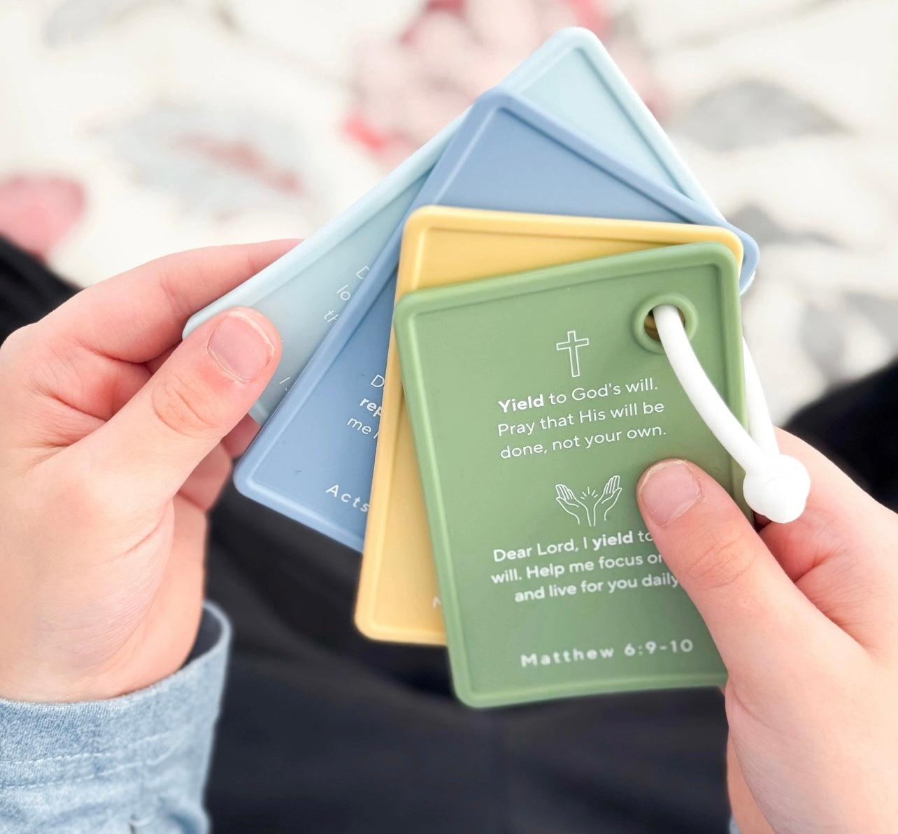 Introduce your family to the power of prayer with our PRAY flashcards! The acronym P-R-A-Y (Praise, Repent, Ask, Yield) serves as a guide when teaching children how to communicate with Jesus through prayer. Complete with Biblical references, these double-sided flashcards help foster a deeper connection with Jesus while enhancing cognitive development, language skills, and visual memory. Featuring a travel-friendly ring and high quality silicone, our flashcards are durable, waterproof and portable making them convenient both at home and on the go.