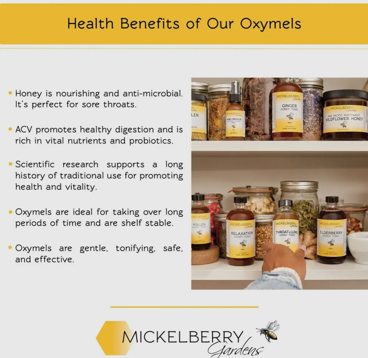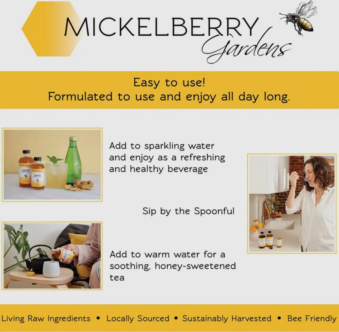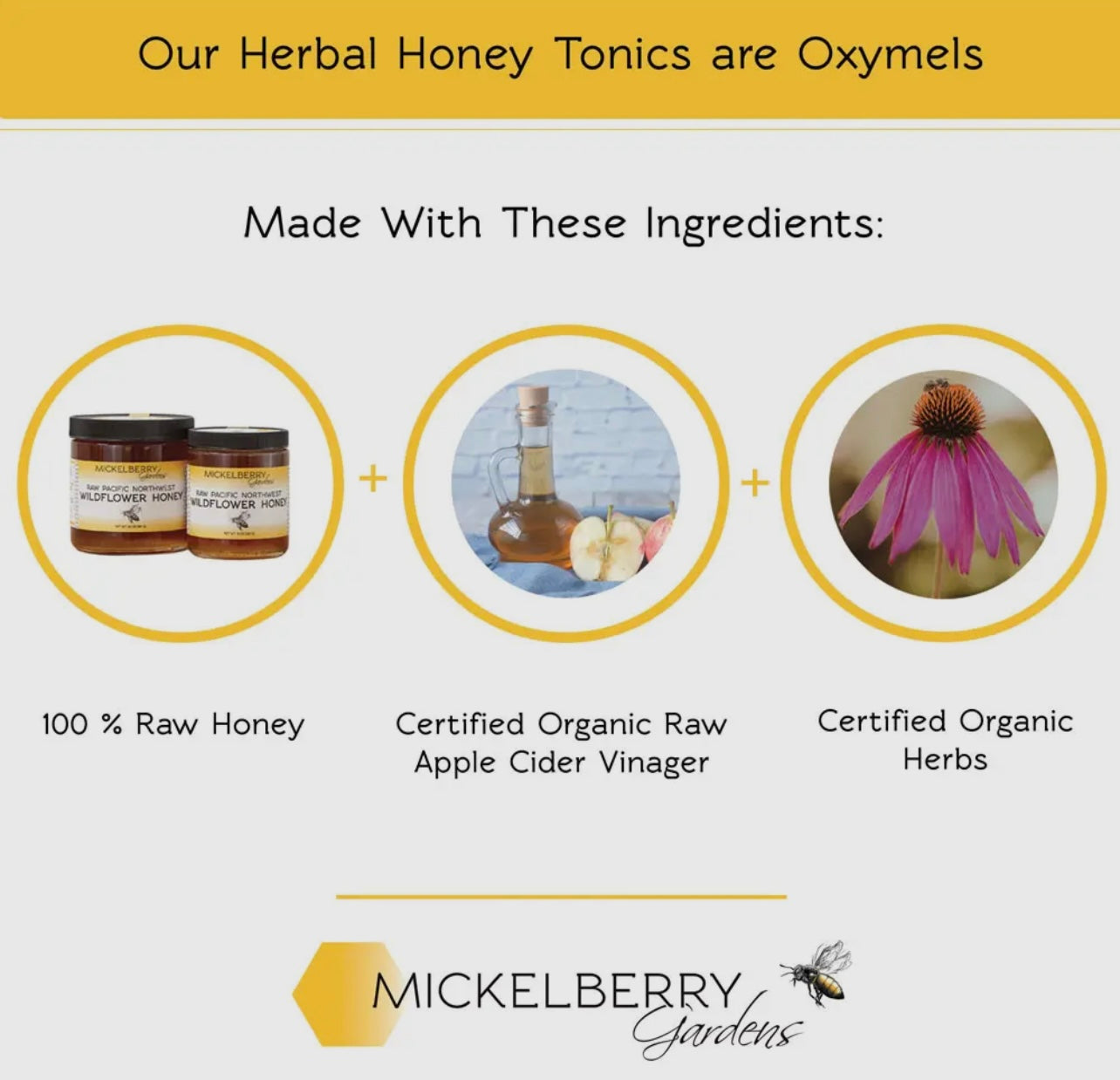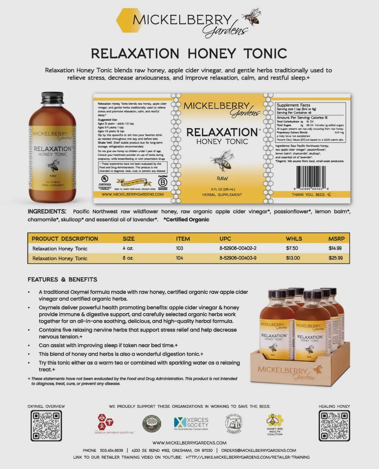 Mickelberry Gardens Relaxation Honey Tonic is a RAW oxymel — made with local raw honey and raw apple cider vinegar. Free of artificial colors, preservatives, fillers, GMOs, and refined sugars. We use the highest quality ingredients available. All our honey and certified organic apple cider vinegar is sourced from regional producers. We only purchase the freshest, whole organic herbs — often direct from local farmers. We make all our products with strict attention to quality. Our facility is certified GMP-compliant, and is free of allergens, including gluten.